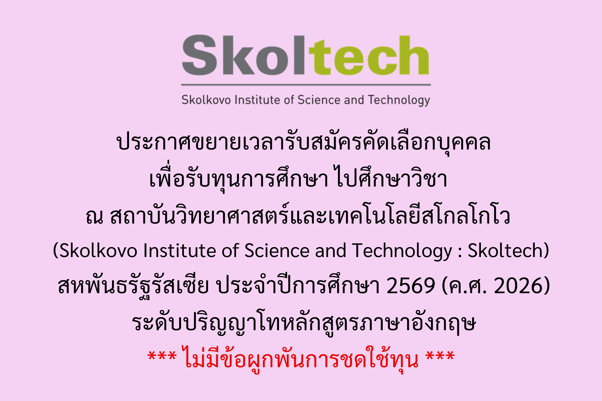 ประกาศรับสมัครคัดเลือกบุคคลเพื่อรับทุนการศึกษา ไปศึกษาวิชา ณ สถาบันวิทยาศาสตร์และเทคโนโลยีสโกลโกโว (Skolkovo Institute of Science and Technology: Skoltech) สหพันธรัฐรัสเซีย ประจำปีการศึกษา 2569 (ค.ศ. 2026) ระดับปริญญาโท หลักสูตรภาษาอังกฤษ