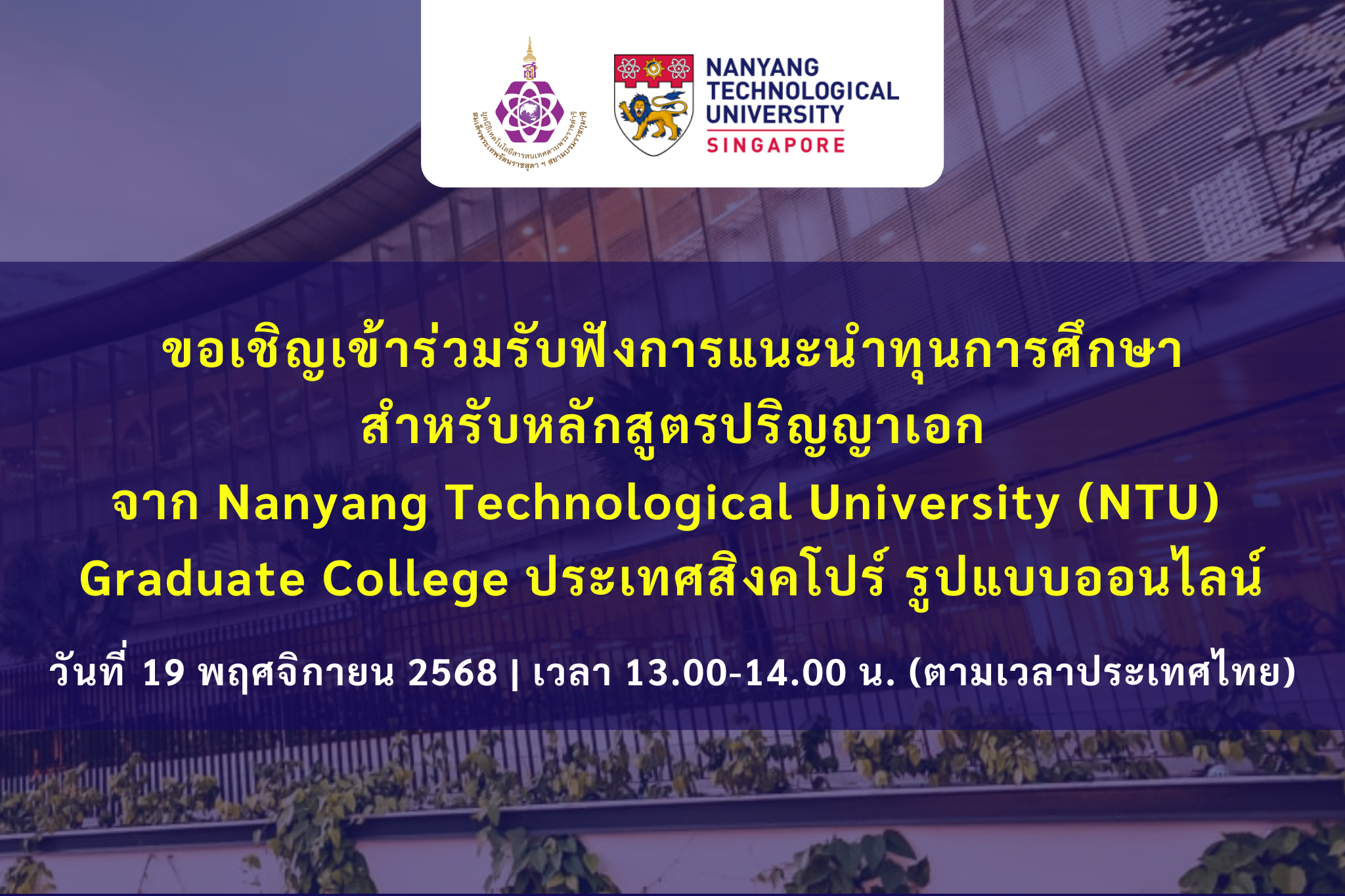 ขอเชิญเข้าร่วมรับฟังการแนะนำทุนการศึกษา สำหรับหลักสูตรปริญญาเอก จาก Nanyang Technological University (NTU) Graduate College ประเทศสิงคโปร์ รูปแบบออนไลน์