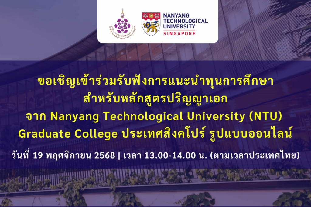 ขอเชิญเข้าร่วมรับฟังการแนะนำทุนการศึกษา สำหรับหลักสูตรปริญญาเอก จาก Nanyang Technological University (NTU) Graduate College ประเทศสิงคโปร์ รูปแบบออนไลน์