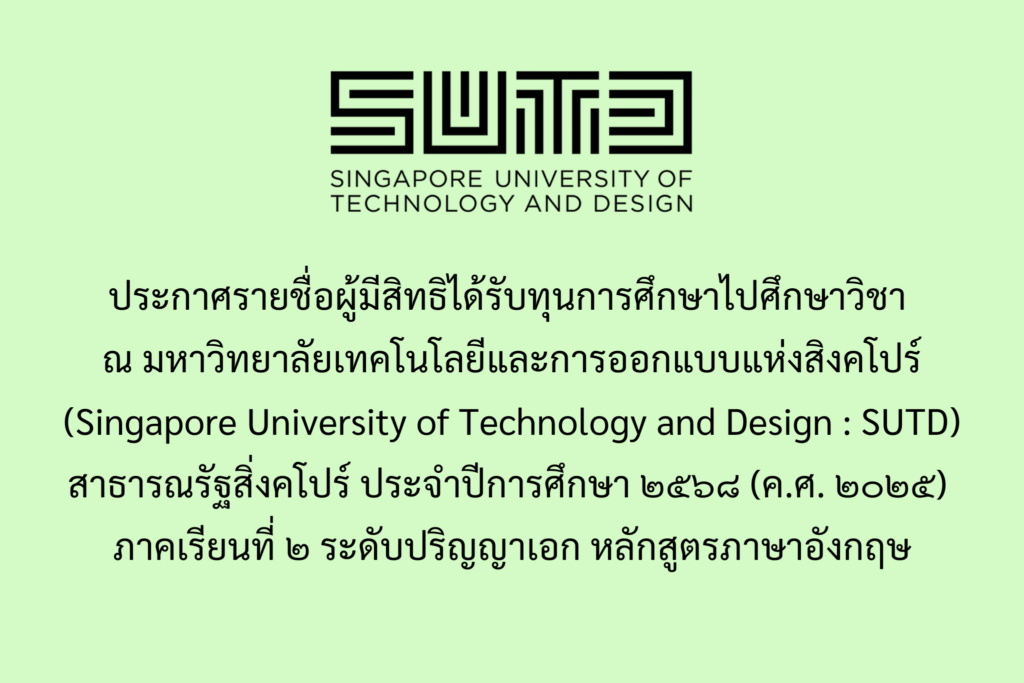 ประกาศขยายเวลาประกาศรายชื่อผู้มีสิทธิได้รับทุนการศึกษาไปศึกษาวิชา ณ มหาวิทยาลัยเทคโนโลยีและการออกแบบแห่งสิงคโปร์ (Singapore University of Technology and Design : SUTD) สาธารณรัฐสิงคโปร์ ประจำปีการศึกษา ๒๕๖๘ (ค.ศ. ๒๐๒๕) ภาคเรียนที่ ๒ ระดับปริญญาเอก หลักสูตรภาษาอังกฤษ