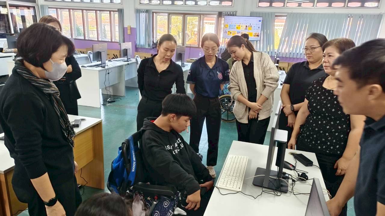 ต่อมาในวันที่ 2 ธันวาคม 2568 ช่วงบ่ายลงพื้นที่โรงเรียนศรีสังวาลย์เชียงใหม่ เพื่อประชุมสรุปผลการดำเนินงานด้านการใช้ไอทีและเทคโนโลยีสิ่งอำนวยความสะดวกช่วยในการจัดการเรียนการสอน การพัฒนาทักษะการสื่อสารสำหรับนักเรียนที่มีข้อจำกัดในการสื่อสารด้วยการพูด การส่งเสริมการเรียนการสอนโค้ดดิ้ง และการจัดการเรียนการสอนวิทยาศาสตร์ พร้อมทั้งเยี่ยมชมการจัดกิจกรรมการเรียนการสอนในชั้นเรียน โดยมีนักเรียนที่มีความบกพร่องทางร่างกายและการเคลื่อนไหว กลุ่ม CP สาธิตการใช้คอมพิวเตอร์ (CP = Cerebral Palsy – สมองพิการ คือเด็กที่มีความบกพร่องทางการเคลื่อนไหวและท่าทางเนื่องจากความเสียหายต่อสมองที่กำลังพัฒนา ทำให้มีปัญหาเรื่องการควบคุมกล้ามเนื้อ แข็งเกร็ง หรืออ่อนแรง ส่งผลต่อการเดิน นั่ง การทรงตัว การพูด และการกิน) โดยนางสาวอลิสา แนะนำครูห้องคอมพิวเตอร์และครูกายภาพในการปรับท่าทางและจัดโต๊ะ เก้าอี้ สื่อและอุปกรณ์เทคโนโลยีสิ่งอำนวยความสะดวกให้เหมาะสม เพื่อให้นักเรียนสามารถทำกิจกรรมได้ผ่อนคลายมากขึ้น เพื่อเพิ่มความแข็งแรงและลดการเกร็ง