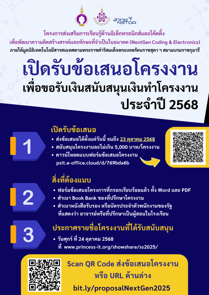 เปิดรับข้อเสนอㆍ ส่งข้อเสนอได้ตั้งแต่วันนี้ จนถึง 23 ตุลาคม 2568ㆍ สนับสนุนโครงงานละไม่เกิน 5,000 บาท/โครงงานㆍ ดาวน์โหลดแบบฟอร์มข้อเสนอโครงงาน psit.e-office.cloud/d/769bda6b