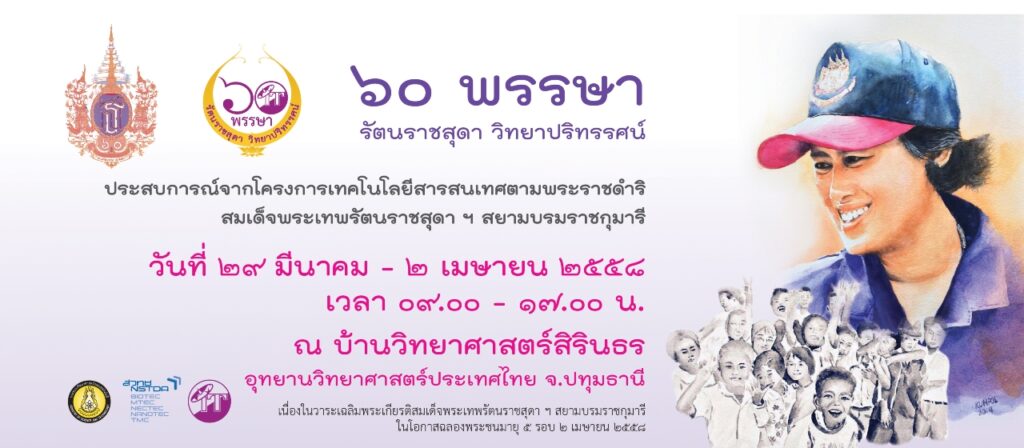 202520/05/2025เรือตัดน้ำแข็งเสว่หลง ๒ (Xue Long 2) เยือนประเทศไทย เพื่อเฉลิมพระเกียรติสมเด็จพระกนิษฐาธิราชเจ้า กรมสมเด็จพระเทพรัตนราชสุดา ฯ สยามบรมราชกุมารี ทรงเจริญพระชนมายุ ๗๐ พรรษา ๒ เมษายน ๖๕๖๘ และเฉลิมฉลองในวาระครบรอบ ๕๐ ปี ของการสถาปนาความสัมพันธ์ทางการทูตระหว่างไทย-จีน ปี พ.ศ. ๒๕๖๘201502/04/2015นิทรรศการ ๖๐ พรรษา รัตนราชสุดา วิทยาปริทรรศน์ วันที่ ๒๙ มีนาคม – ๒ เมษายน ๒๕๕๘ ณ บ้านวิทยาศาสตร์สิรินธร อุทยานวิทยาศาสตร์ประเทศไทย จังหวัดปทุมธานี200814/11/200812 ปี รัตนราชสุดา สารสนเทศMore