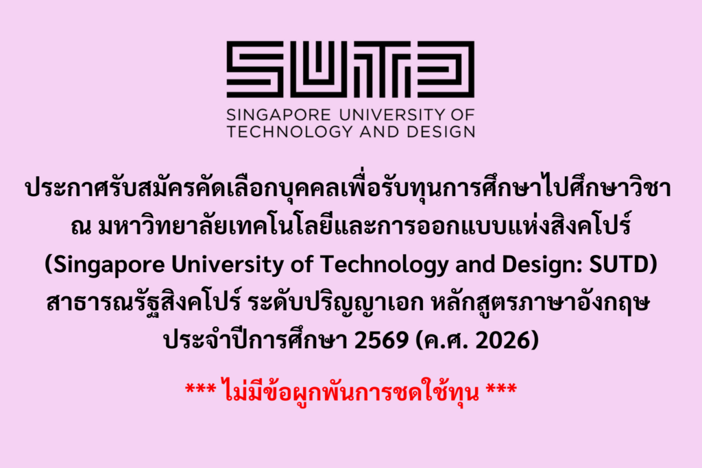 ประกาศรับสมัครคัดเลือกบุคคลเพื่อรับทุนการศึกษาไปศึกษาวิชา ณ มหาวิทยาลัยเทคโนโลยีและการออกแบบแห่งสิงคโปร์ (Singapore University of Technology and Design: SUTD) สาธารณรัฐสิงคโปร์ ระดับปริญญาเอก หลักสูตรภาษาอังกฤษ ประจำปีการศึกษา 2569 (ค.ศ. 2026)