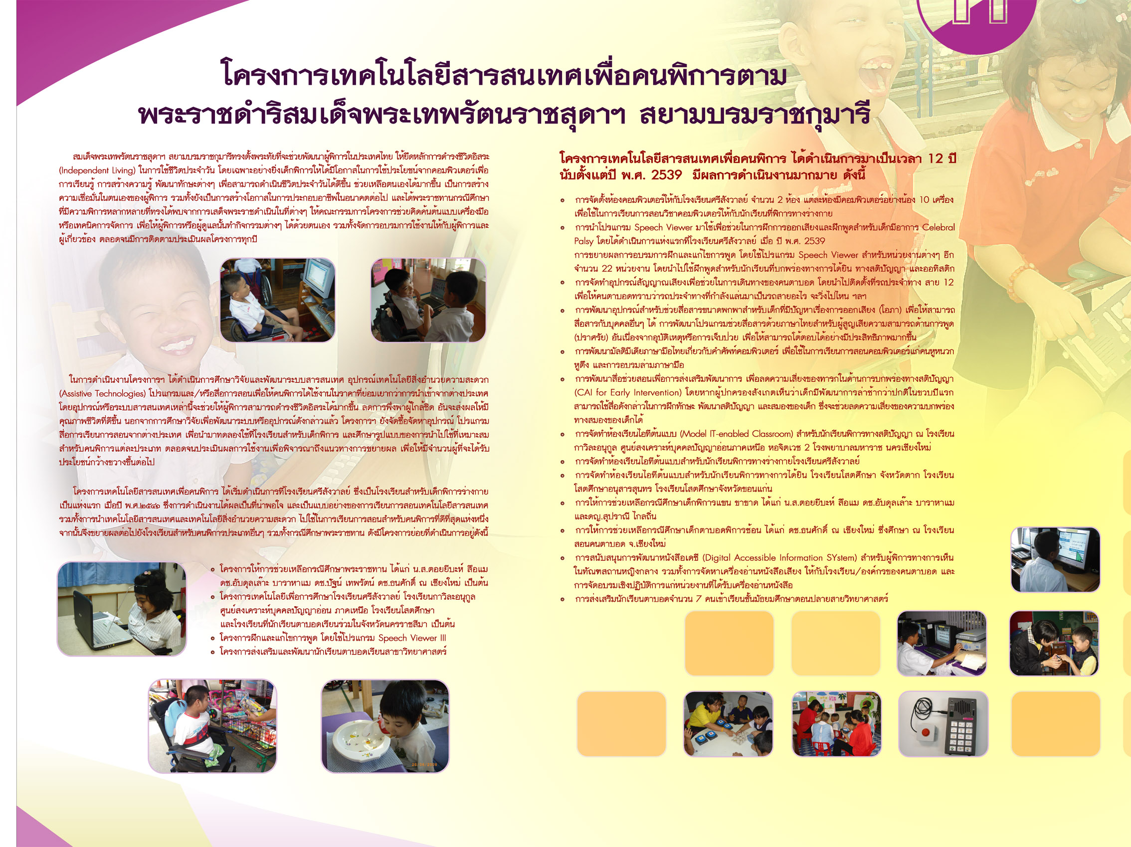 จากนั้นทรงกล่าวปาฐกถาพิเศษเรื่อง “การประยุกต์เทคโนโลยีสารสนเทศเพื่อการพัฒนาคุณภาพชีวิตของผู้ด้อยโอกาสในสังคม” ใจความว่า เทคโนโลยีสารสนเทศหรือไอซีที เป็นเรื่องที่ใช้กันมากและพูดกันมานาน ซึ่งไอซีทีในที่นี้หมายถึงอุปกรณ์หรือเครื่องมืออิเล็กทรอนิกส์ที่มีความสามารถให้เกิดการติดต่อระหว่าง คนกับคน คนกับเครื่อง และเครื่องกับเครื่อง โดยการใช้ให้เป็นประโยชน์หรือโทษนั้นจะโทษอุปกรณ์ไม่ได้ เครื่องมือก็คือเครื่องมือ จะดี ไม่ดี อย่างไรขึ้นอยู่กับว่าคนจะเอาไปใช้เป็นประโยชน์หรือเป็นโทษ